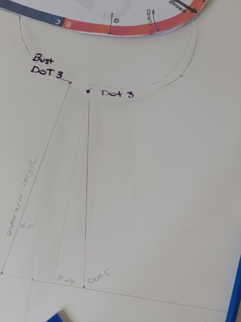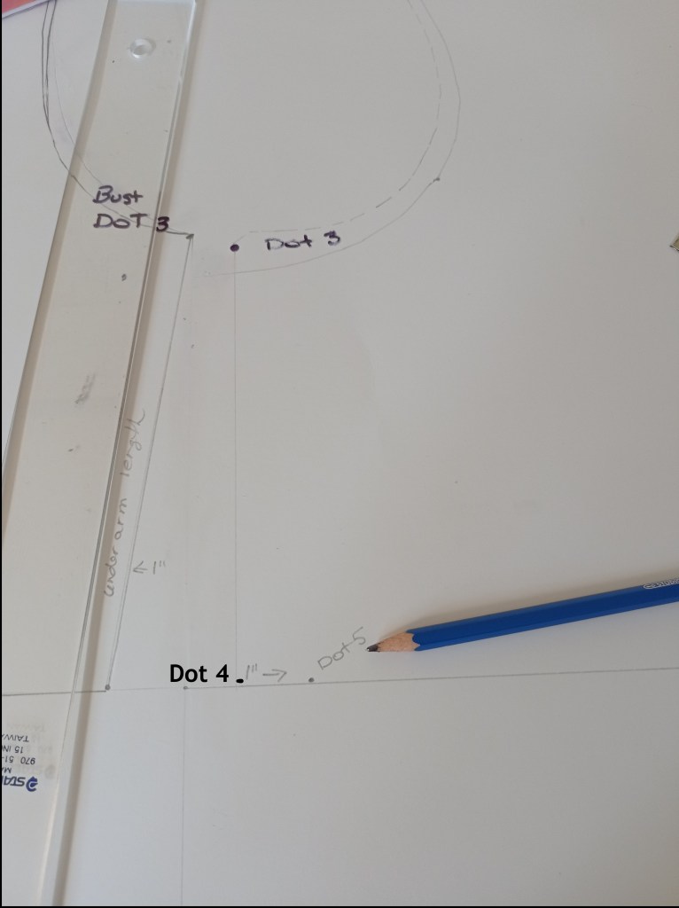 Draw the Underarm. Draw a dotted line from Dot 3 to Dot 4 (the original dot, to the left of Dot 5). Then measure inwards 1″ and mark as Dot 5. Draw a straight line from Dot 3 to Dot 5. Continue the underarm to the required length.