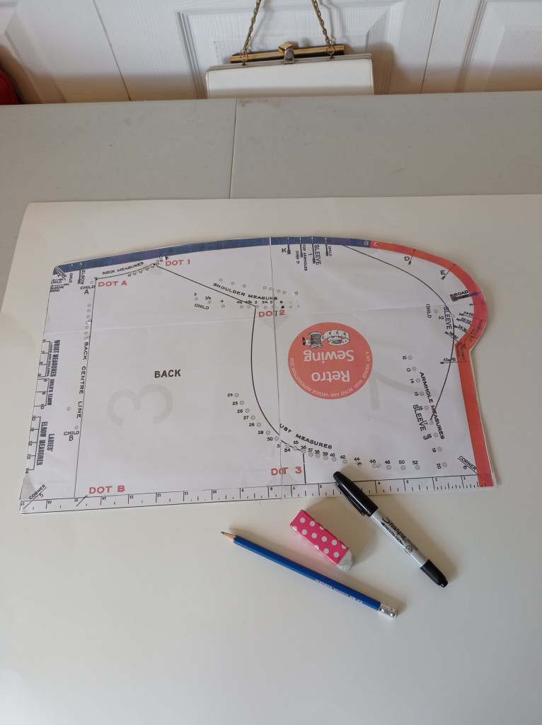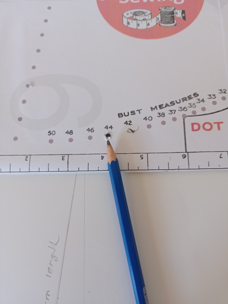 (Bust 24″-42″) turn the Chart over to the back with the long straight edge to your left, and place it to Dot 3, the Armhole arrow corresponding to the bust measurement required. Draw a line from Dot 3 to Dot 2.