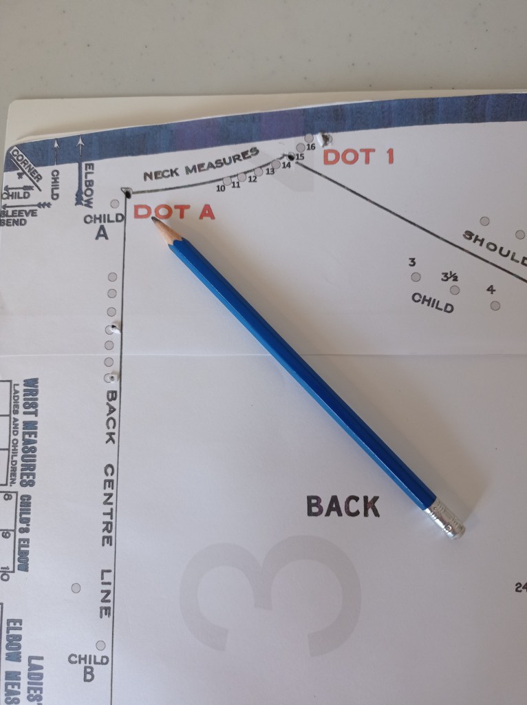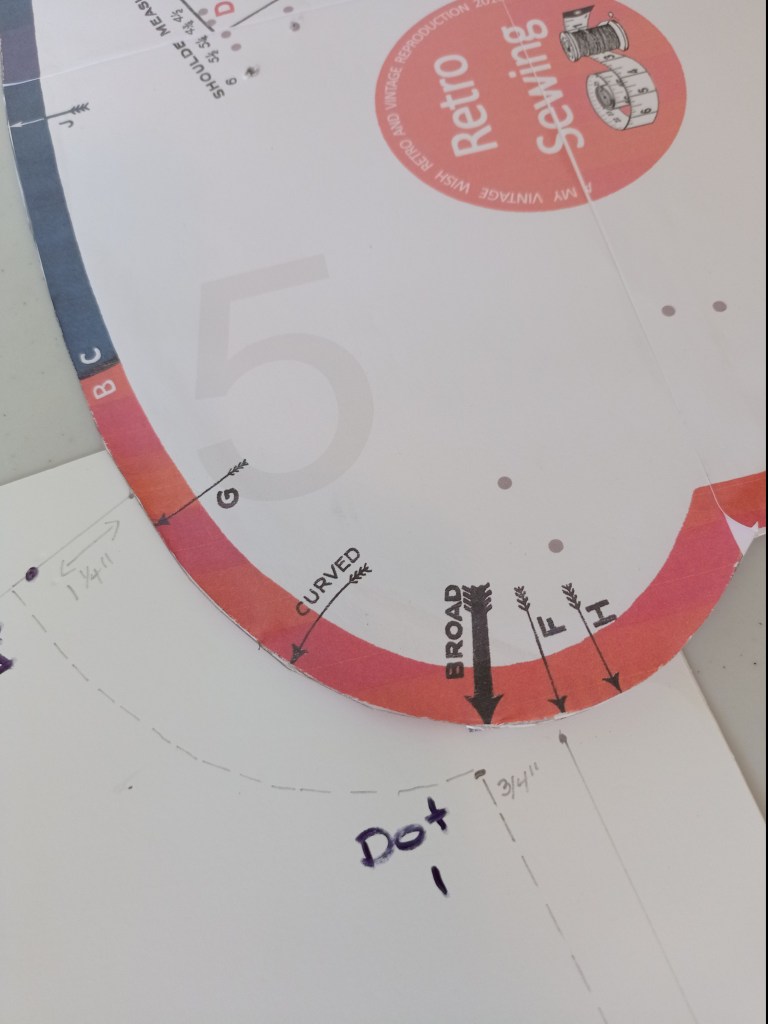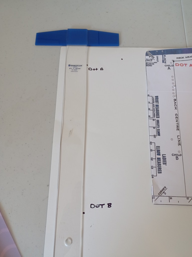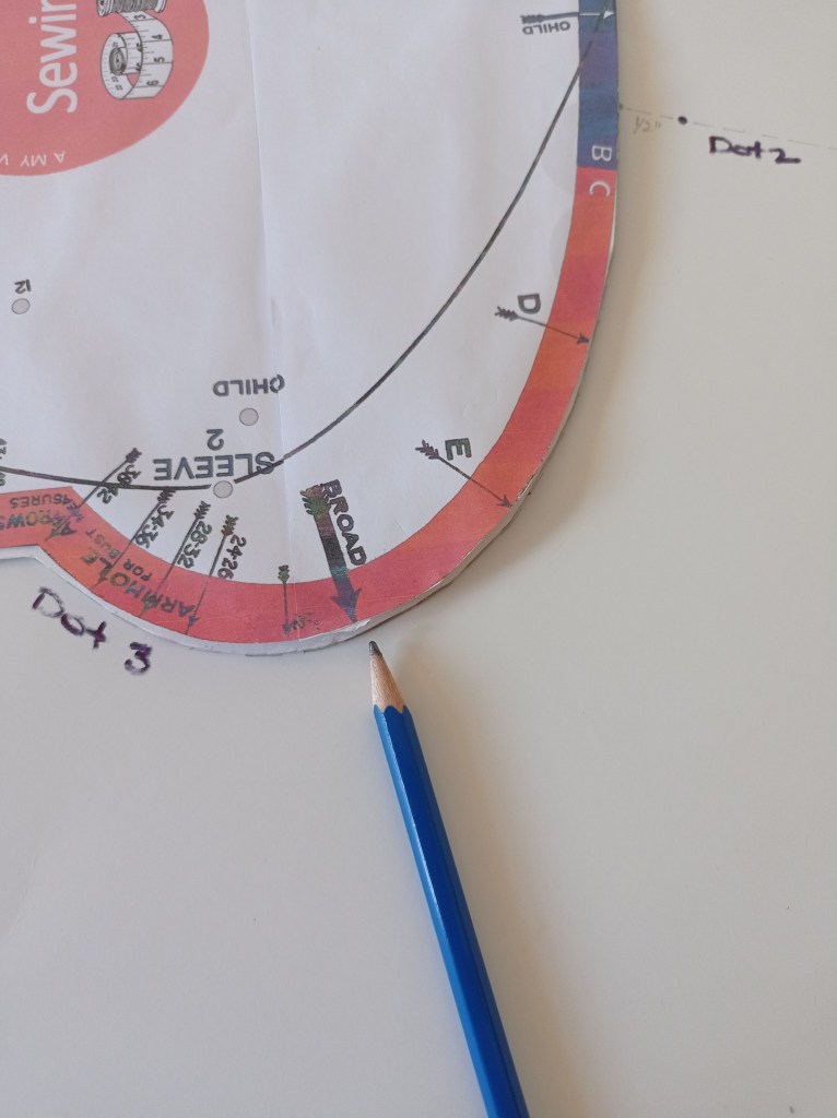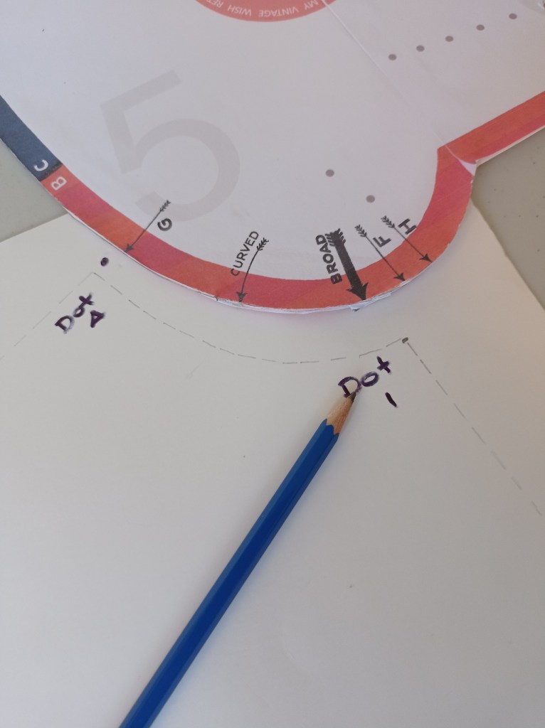 Make sure to note, which dot is which. Knowing where they are, will be important and help you out when you make the pattern pieces! Once you have created the above dots, you will now be moving the template around to make the rest of the lines and curves.