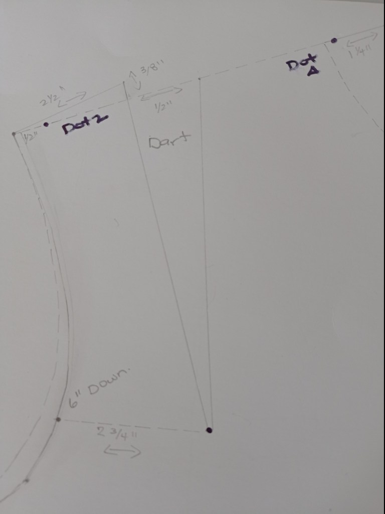 Draw a dotted Shoulder line from Dot A to Dot 2. (bust 40″+ make a dot 1/2″ to the left of Dot 2 to allow for Dart (as shown in Diagram (Foundation Draftings with Instructions)))